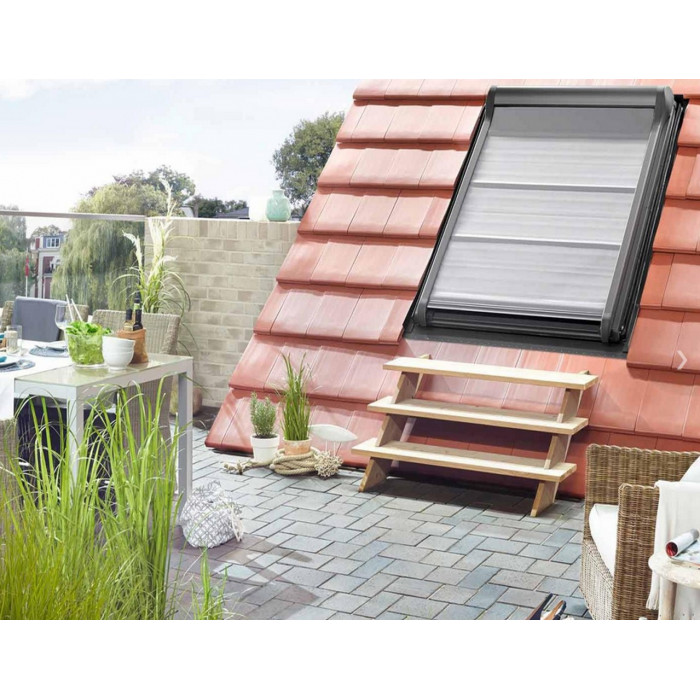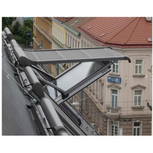 Markiza zewnętrzna sterowana elektrycznie, zabezpiecza poddasze przed upałem, zachowując przy tym dopływ światła. Konkstrukcja zapewnia możliwość nieograniczonej obsługi przy otwartym oknie.