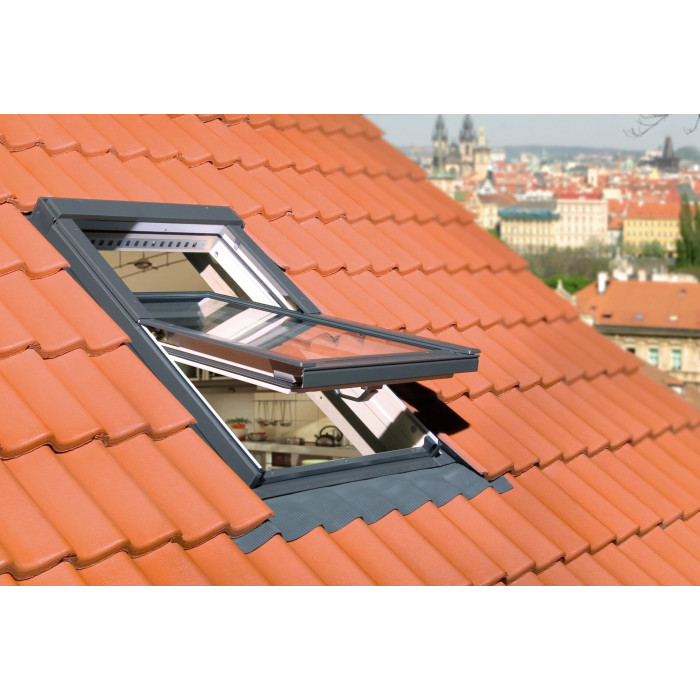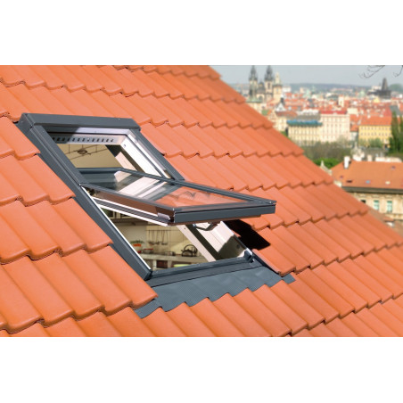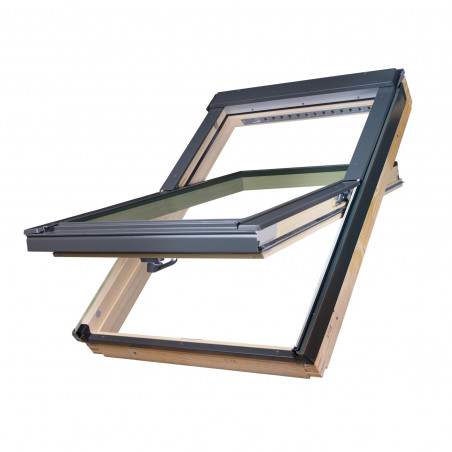 Okno dachowe Fakro FTP-V U4 RAL 7022 z nawiewnikiem V40P i szybą energooszczędną – obrotowe okno do poddaszy z klejonego drewna sosnowego malowane dwukrotnie lakierem akrylowym.